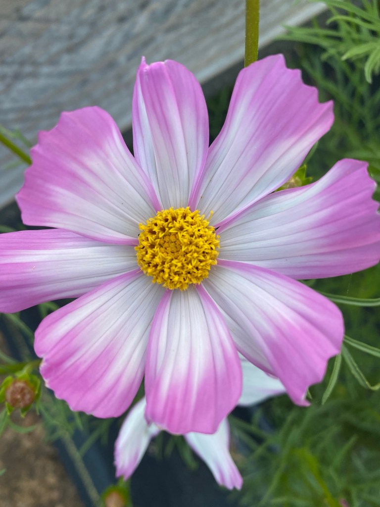Cosmos flowers are known for their tall, slender stems that can reach up to 3-6 feet in height. They have delicate, feathery foliage and produce an abundance of showy, daisy-like flowers in shades of pink, white, red, and orange. The flowers have a single row of petals surrounding a vibrant, yellow center, giving them a unique and eye-catching appearance.